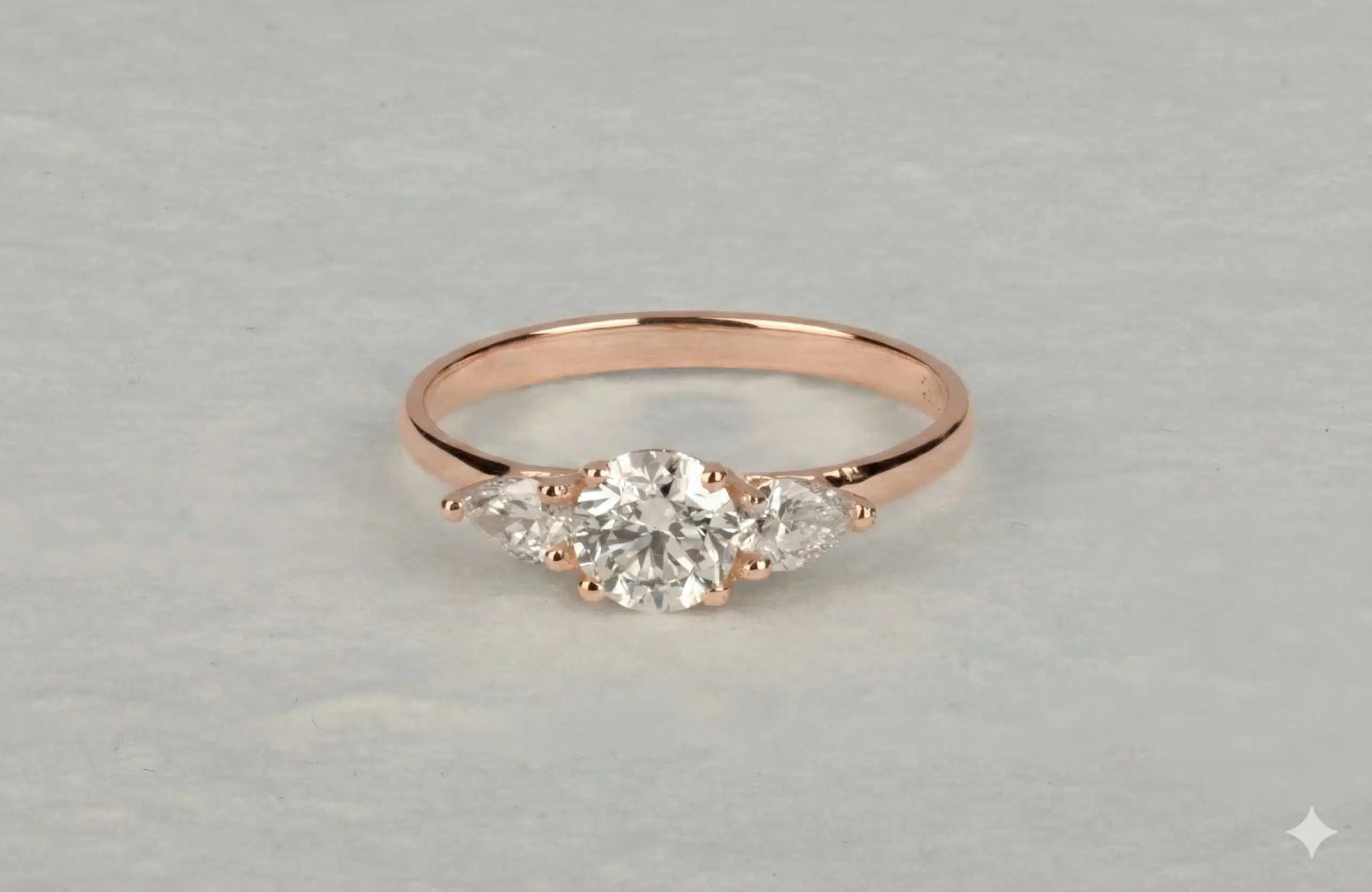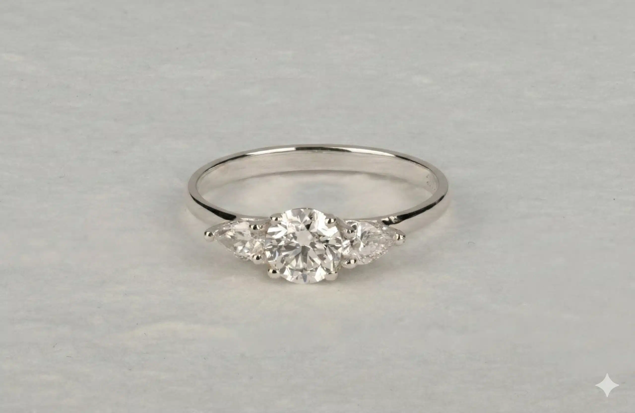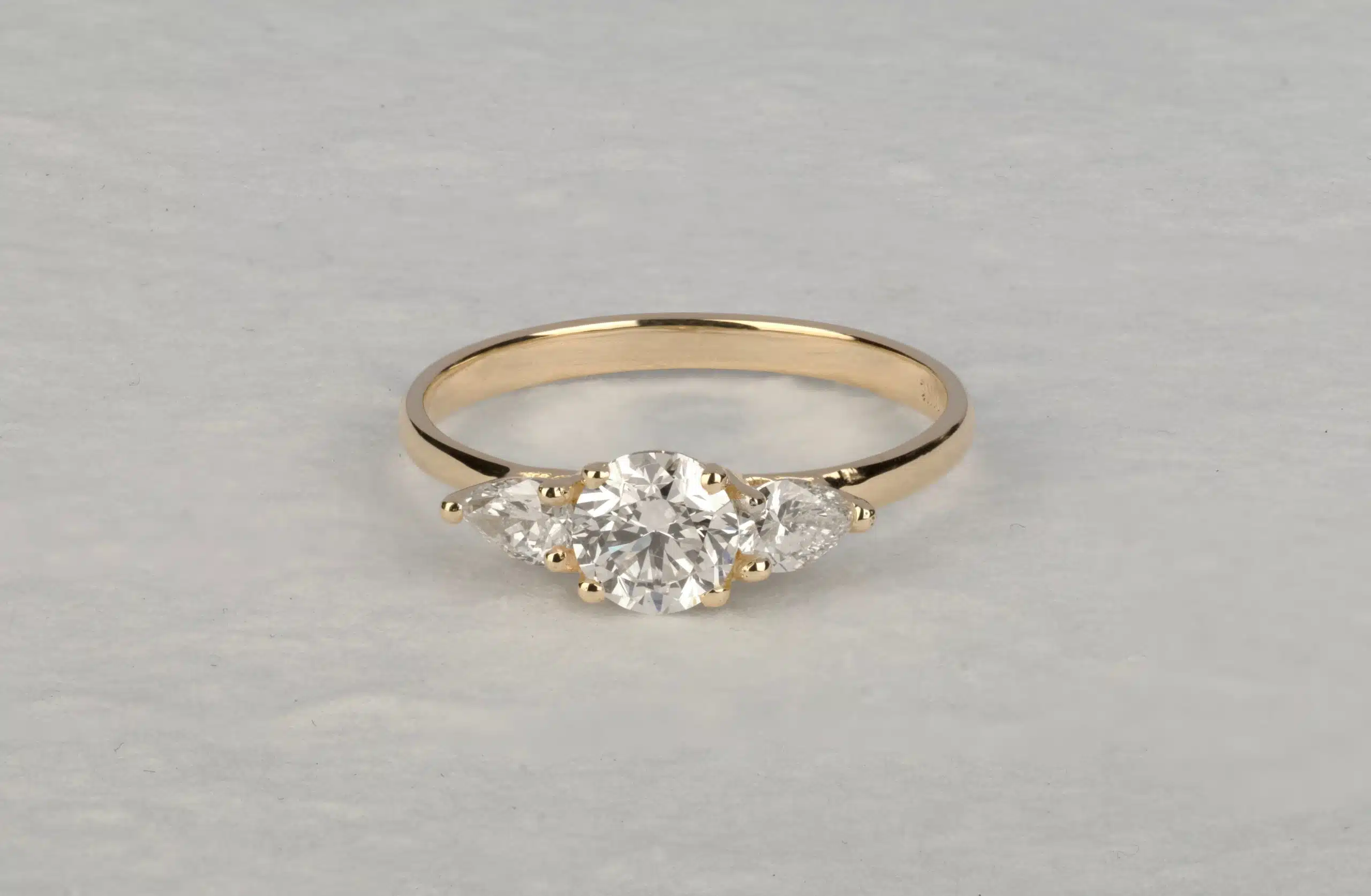 טבעת עם יהלום עגול במרכז ושני יהלומים בחיתוך טיפה מכל צד. טבעת עדינה ויפה מלאה בסטייל ויוקרה.